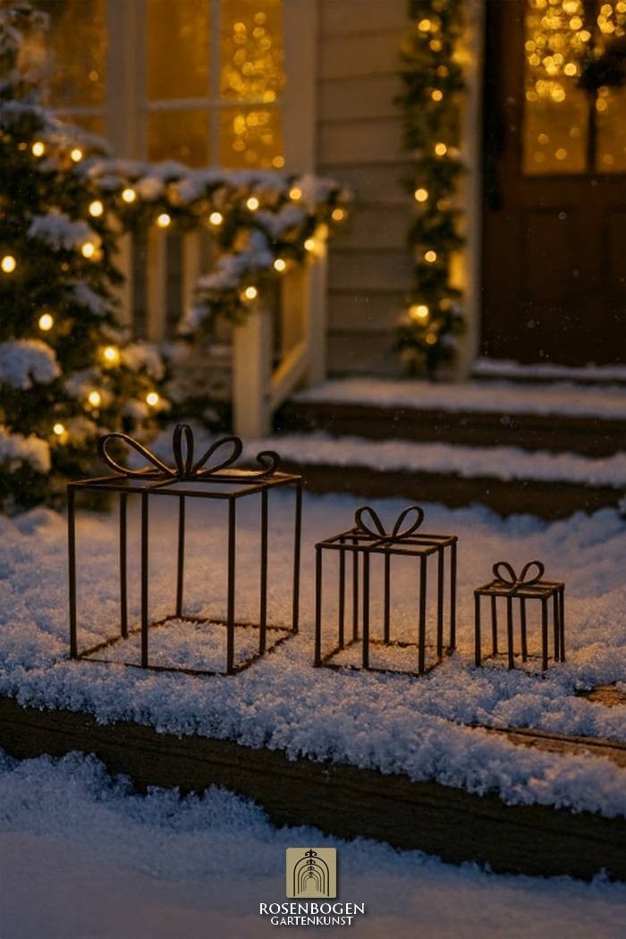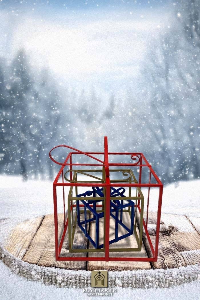 Gåvor 3 set - juldekoration. Alla i färg eller rost. Liten gåva i blått, medium gul, stor röd
