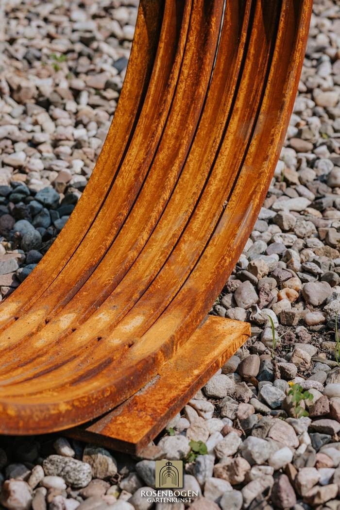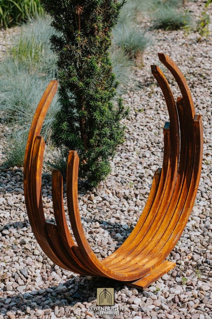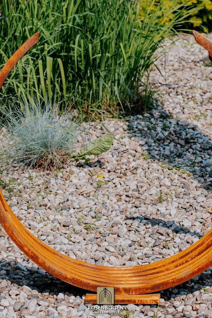 Den rostfärgade patinan integreras perfekt i naturliga trädgårdsmiljöer - oavsett om det är i grusbäddar, mellan prydnadsgräs eller som en fristående skulptur på gräsmattan. Pinio står stadigt och kan stå utomhus året runt